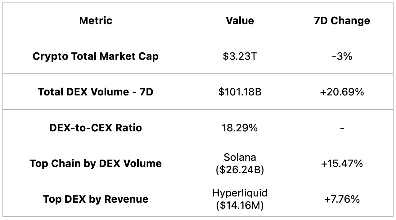 Despite a 3% dip in total crypto market cap to $3.23T, DEX activity remained strong with weekly volume rising 20.69% to $101.18B. Solana led DEX volume growth (+15.47%), while Hyperliquid remained the top-earning DEX with $14.16M in revenue.