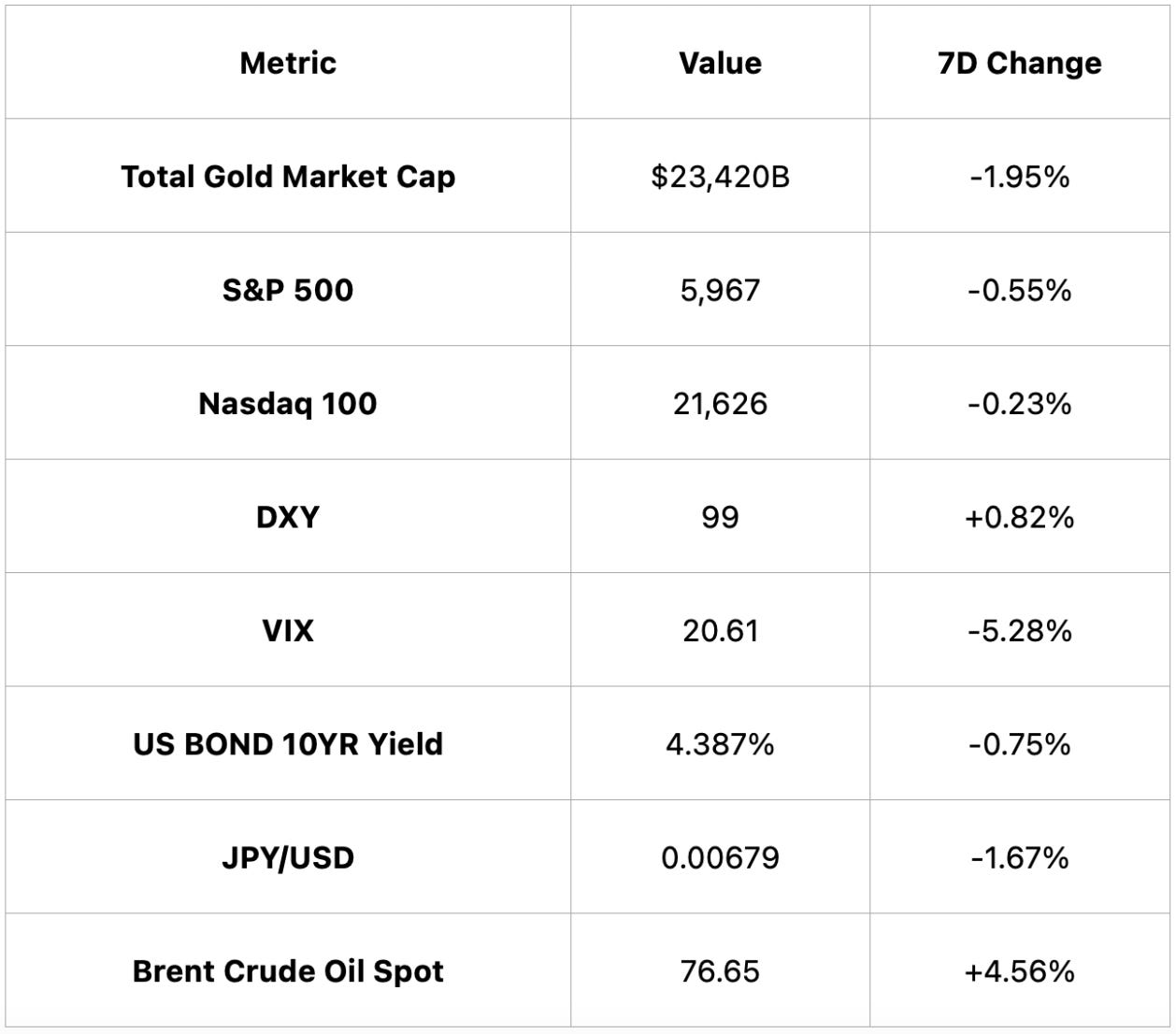 Gold and equities saw mild declines, the dollar index (DXY) rose 0.82%, while volatility dropped and Brent crude surged 4.56%, reflecting shifting macro sentiment.