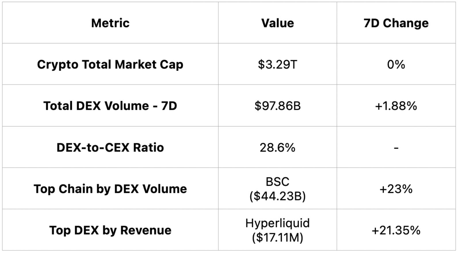 Despite a flat crypto market cap, DEX activity picked up with a 1.88% volume rise, BSC leading with $44.23B and Hyperliquid revenue jumping 21.35%.