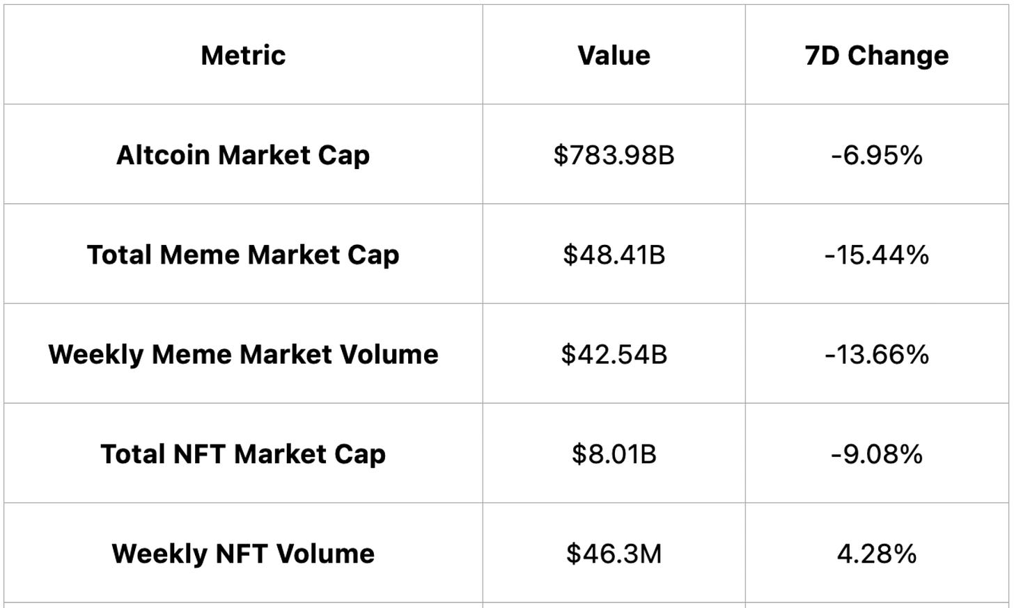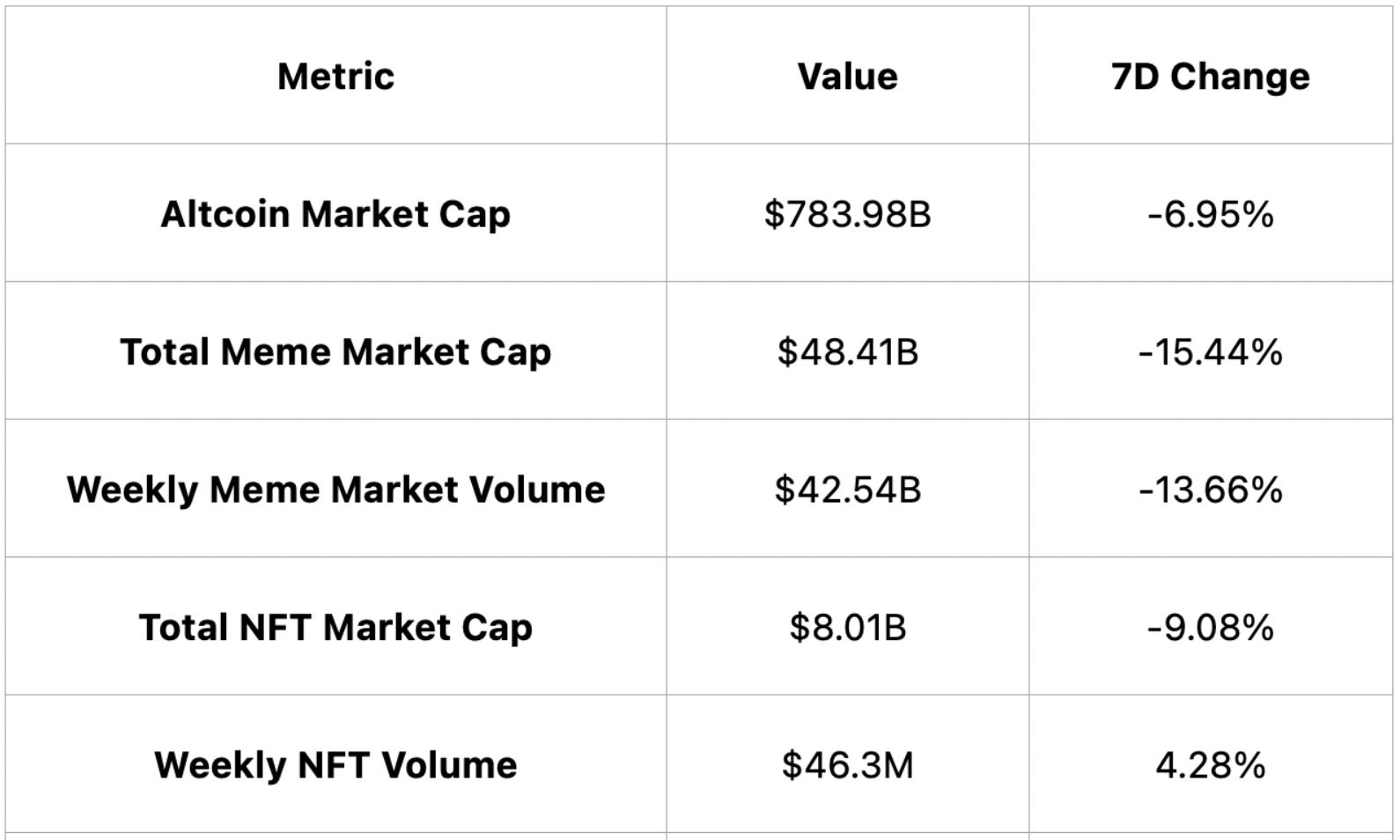 Altcoin market cap dropped 6.95%, dragged down by a 15.44% slump in memecoins; meanwhile, NFT market cap fell 9.08% but weekly NFT trading volume rose 4.28%.