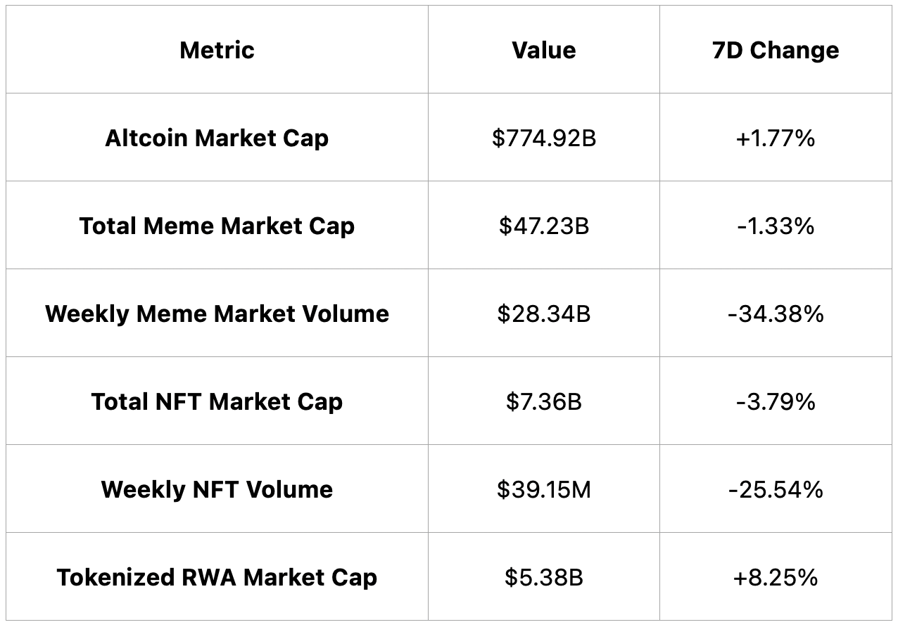 Tokenized RWA market cap showed resilience, rising 8.25%. In contrast, meme and NFT markets declined across both market cap and volume metrics, signaling reduced speculative activity.