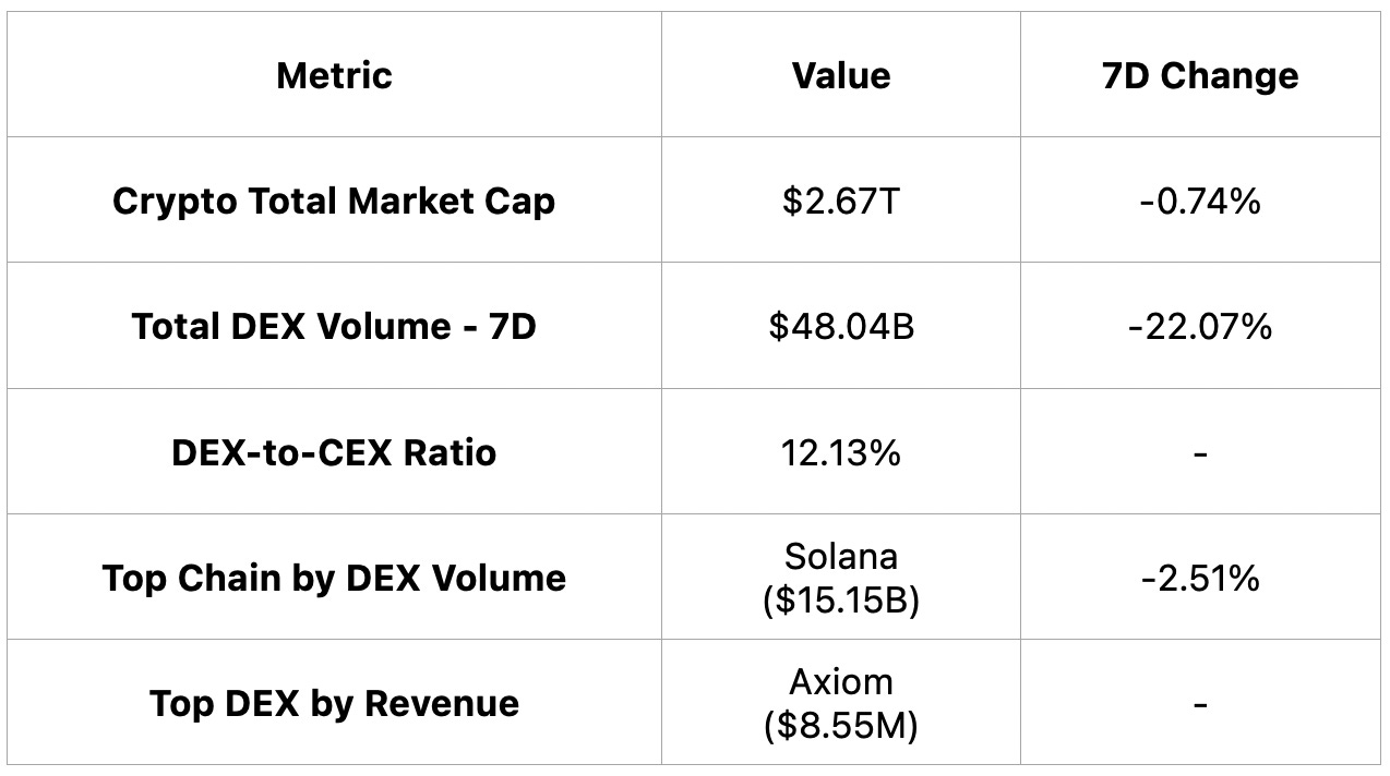 Crypto market cap dipped slightly by 0.74% this week, while DEX volume saw a sharp 22.07% decline, indicating reduced on-chain trading activity. Solana became the top chain by DEX volume despite a 2.51% drop, and Axiom led in DEX revenue with $8.55M, surpassing Hyperliquid.
