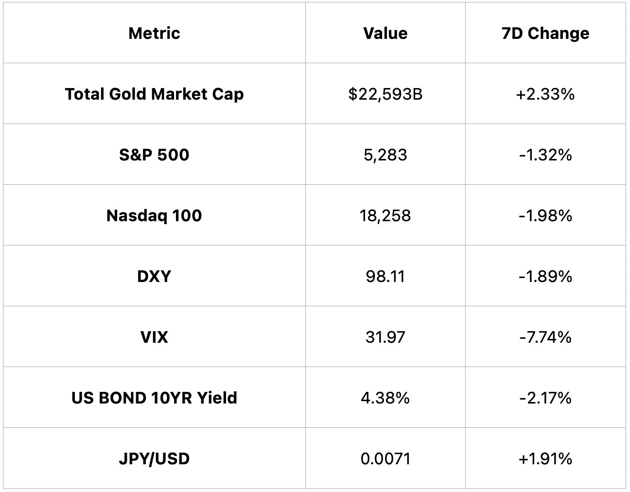 Gold outperformed as it gained 2.33% this week, while major U.S. indices like the S&P 500 and Nasdaq 100 declined. The dollar weakened, bond yields fell, and the JPY appreciated, signaling a shift toward safer assets.