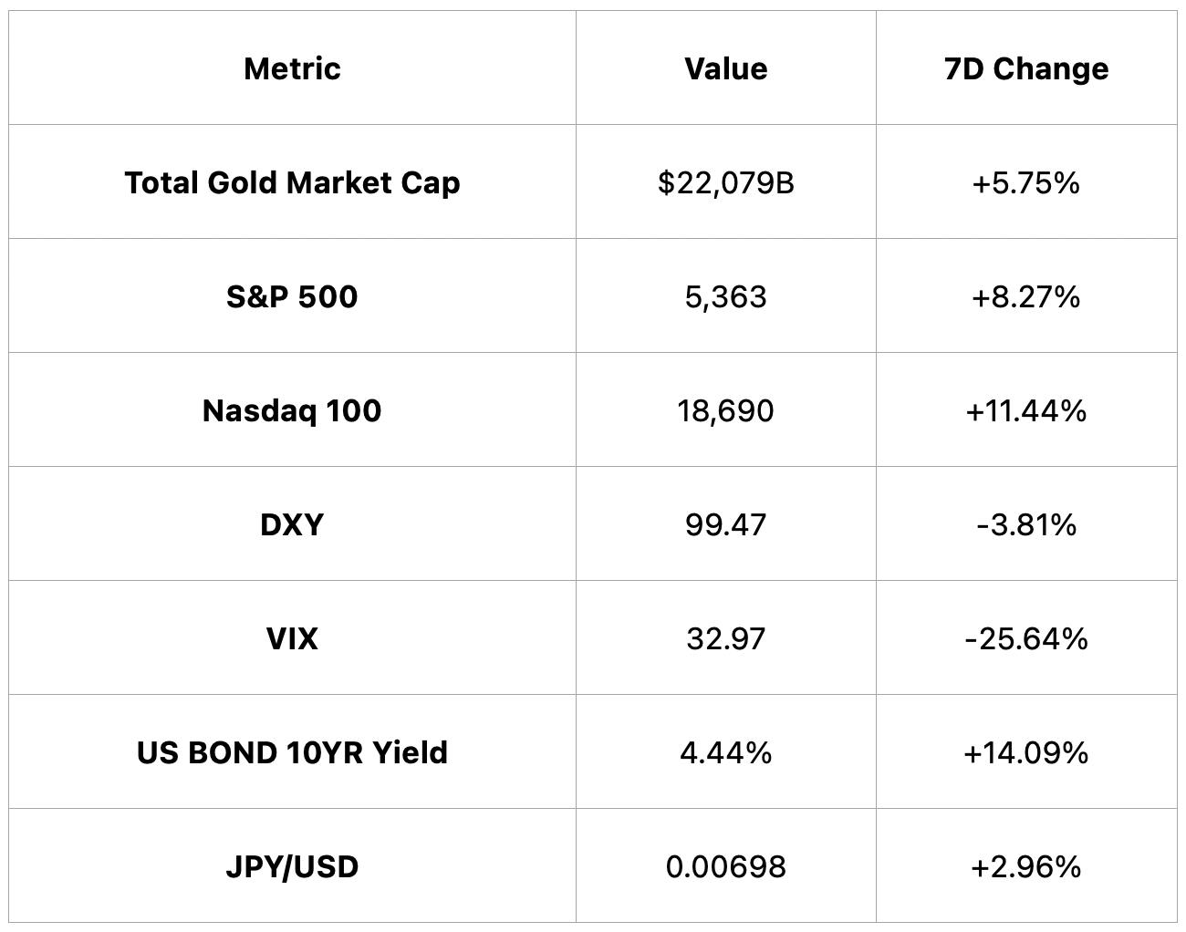 Traditional markets rallied sharply with Nasdaq up 11.44% and gold up 5.75%; bond yields surged, reflecting increasing macro volatility.