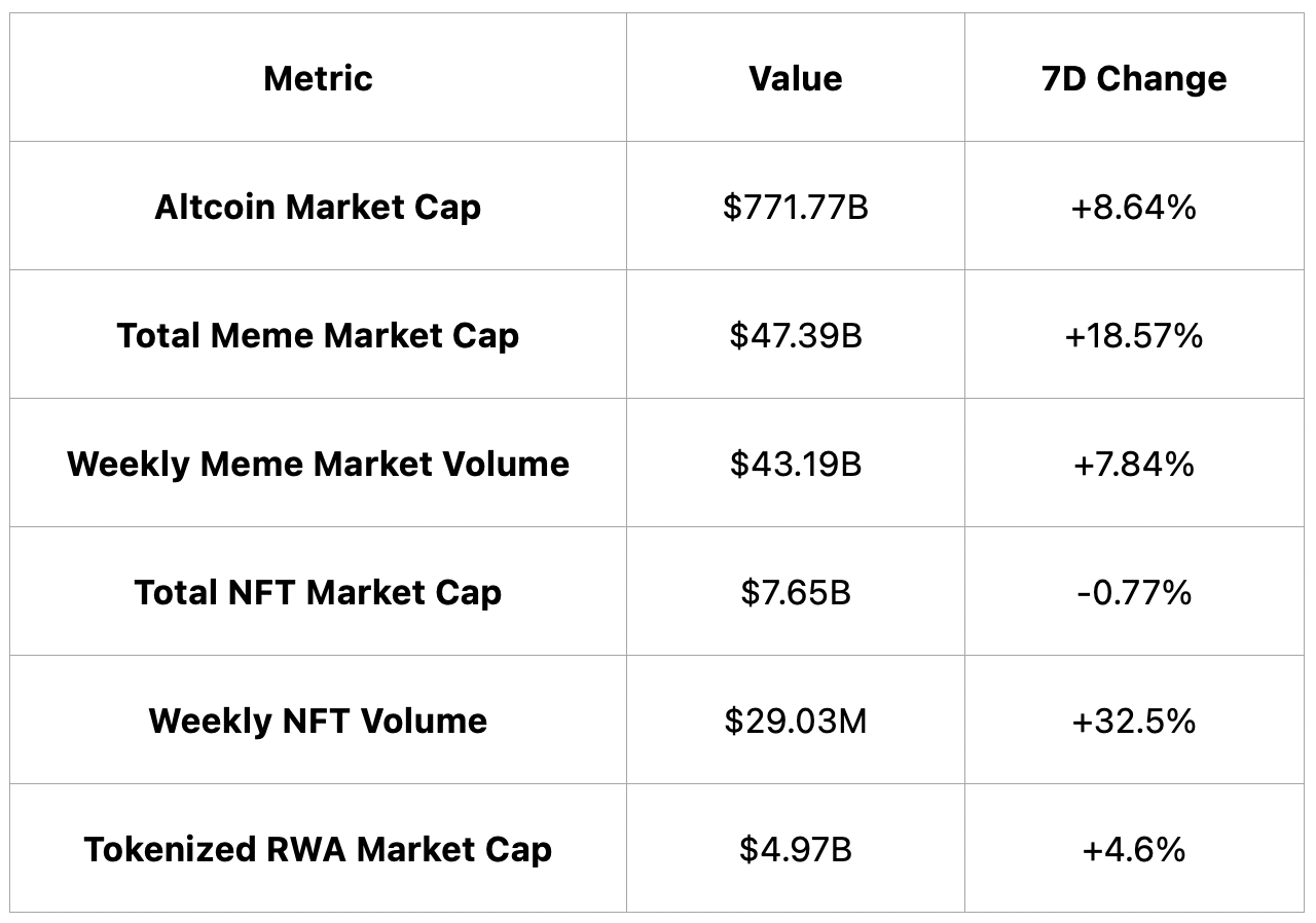 Meme coins led market momentum with an 18.57% surge in market cap, while NFT market cap dipped slightly despite a 32.5% rise in trading volume; tokenized RWA Market Cap posted moderate gains.