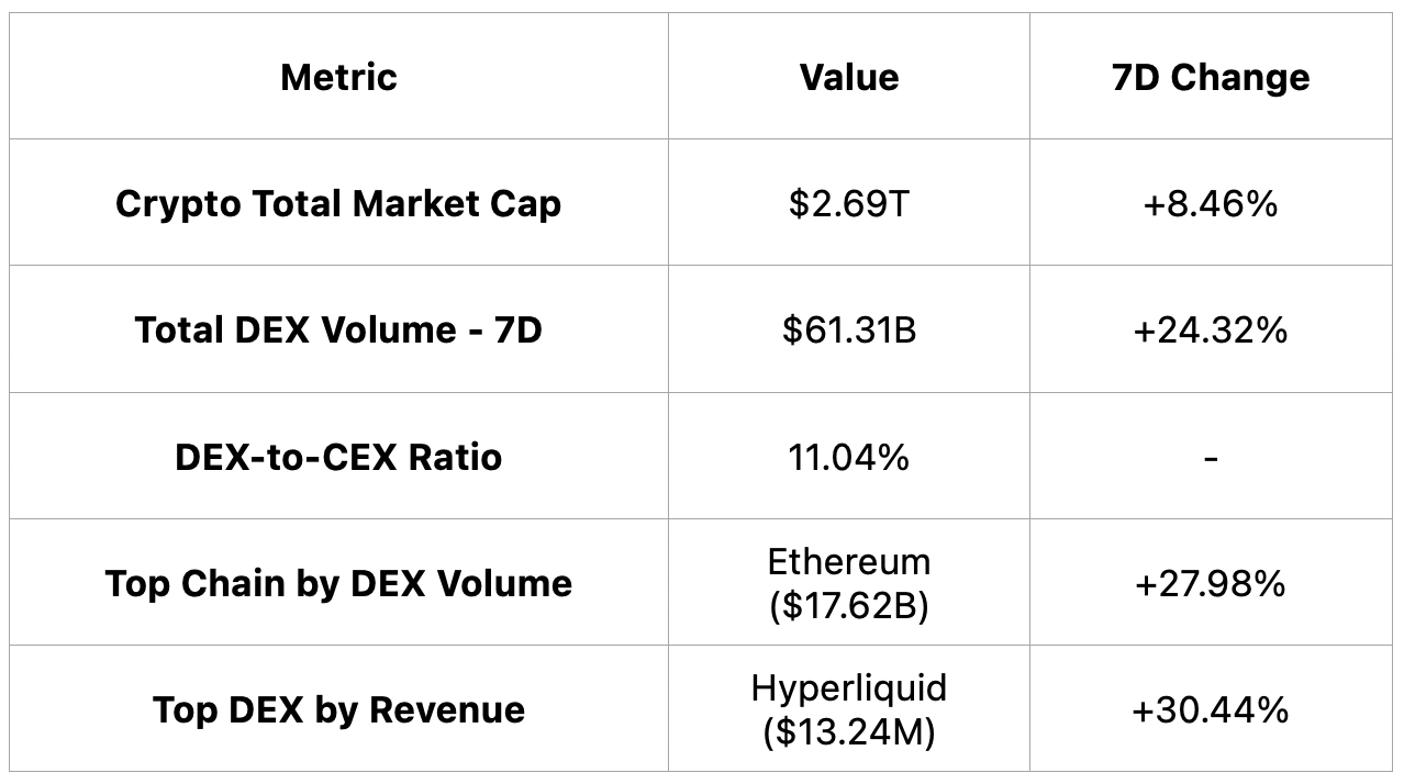 The crypto market saw strong growth over the past week, with total market cap up 8.46%, DEX volume rising 24.32%, and Hyperliquid leading in revenue while Ethereum remained the top chain by DEX volume.