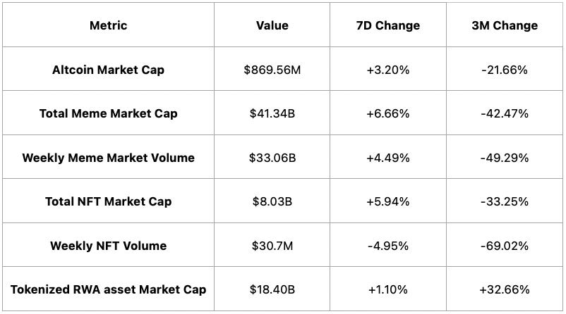 Memes and NFTs showed modest weekly rebounds ( Meme cap +6.66%, NFT cap +5.94%), though all remain deeply negative on a three-month basis, while tokenized RWAs held steady with a 1.10% weekly gain and strong 32.66% three-month outperformance.