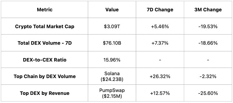 Crypto market cap climbed 5.46% WoW to $3.09T, while 7D DEX volume reached $76.10B (+7.37% WoW) with Solana ($24.23B) and PumpSwap ($2.15M) leading chain volumes and DEX revenues.
