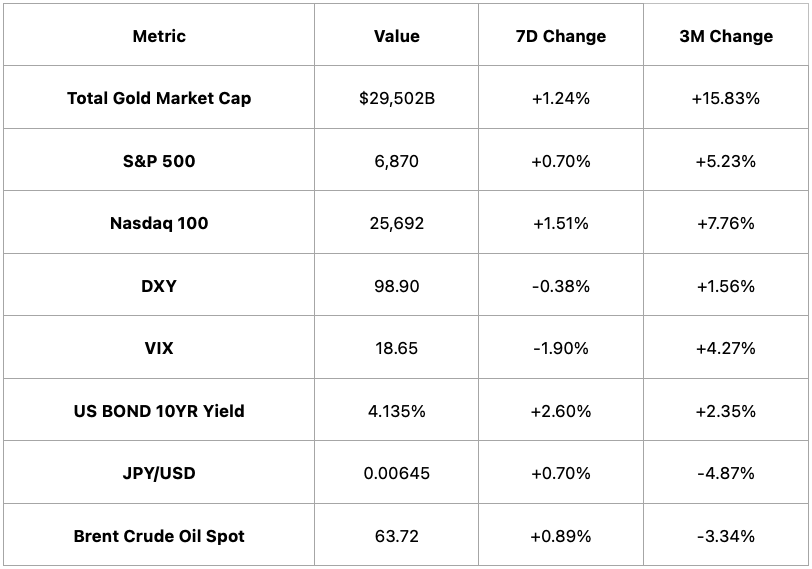 Gold gained 1.24% WoW, equities advanced modestly (S&P 500 +0.70%, Nasdaq 100 +1.51%), the dollar softened and volatility fell (DXY –0.38%, VIX –1.90%), while the 10Y yield rose 2.60% WoW and oil inched up 0.89%.
