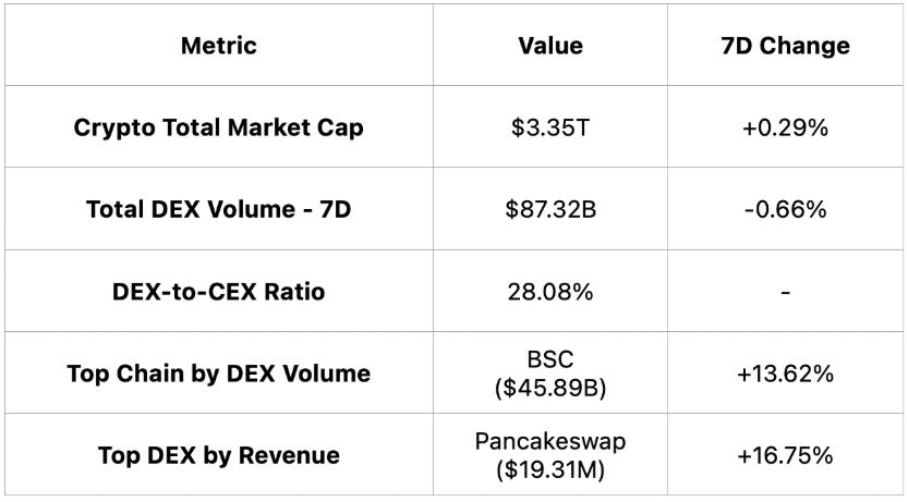 The crypto market cap rose slightly to $3.35T (+0.29%), while total DEX volume dipped to $87.32B (-0.66%); BSC led with $45.89B in DEX volume (+13.62%) and PancakeSwap generated $19.31M in revenue (+16.75%).