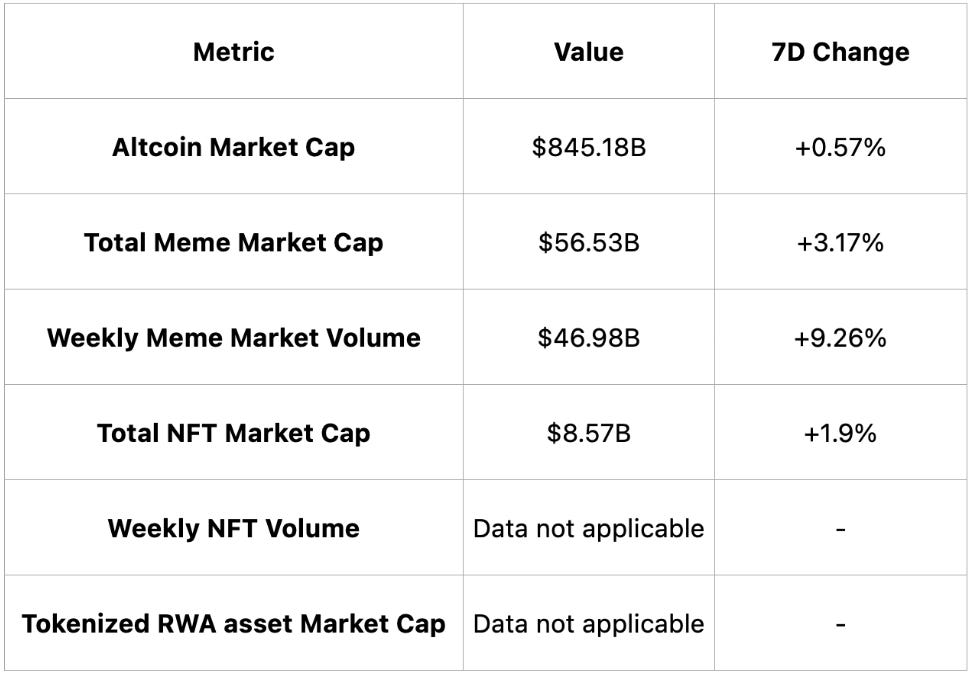 Altcoin market cap rose to $845.18B (+0.57%), driven by momentum in meme coins, which saw a 3.17% increase in market cap and a 9.26% rise in weekly trading volume.
