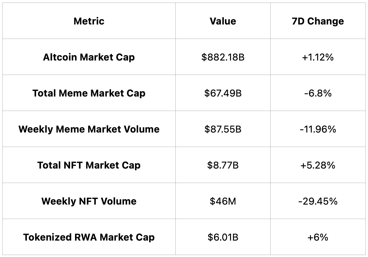 In contrast, tokenized RWAs and NFT market caps rose 6% and 5.28% respectively, though NFT trading volume plunged 29.45%.