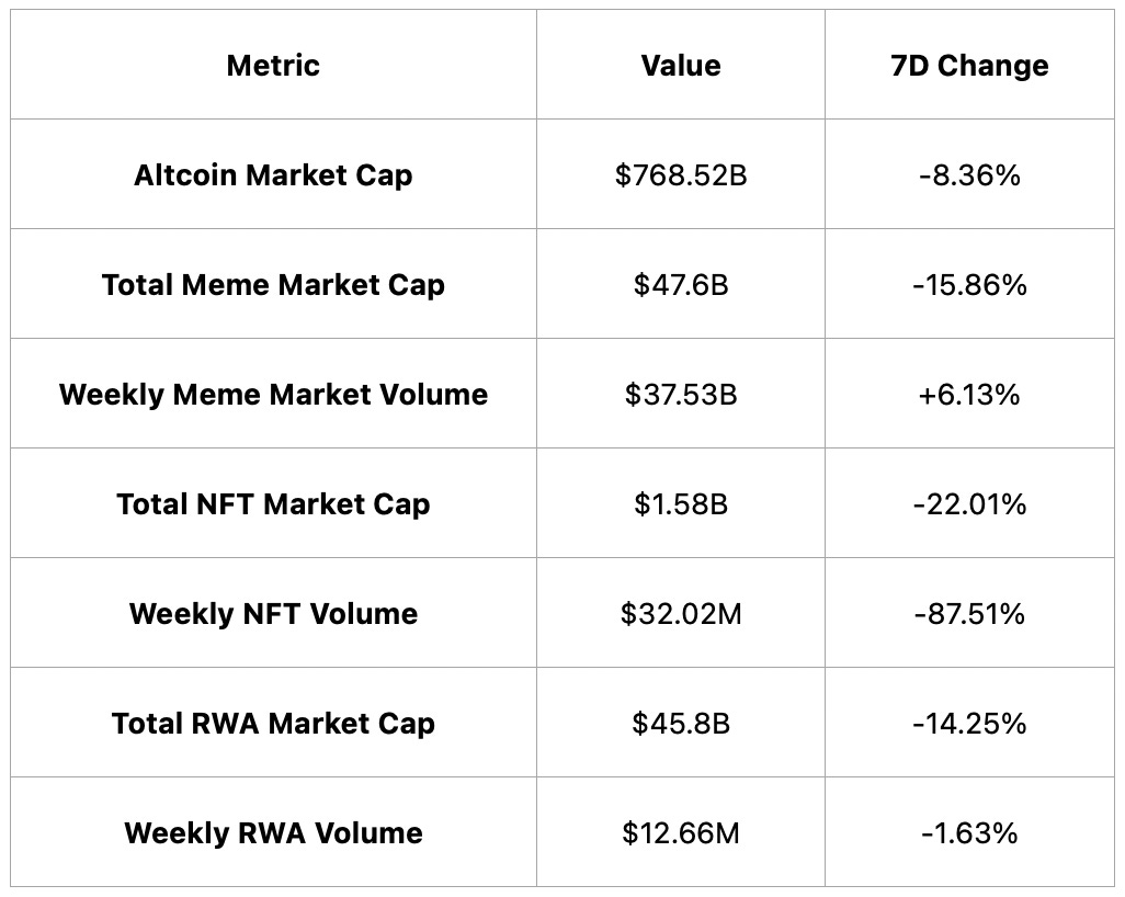 Altcoins, NFTs, and RWAs saw notable declines this week, while meme coin trading volume defied the trend with a 6.13% increase despite a 15.86% drop in market cap.