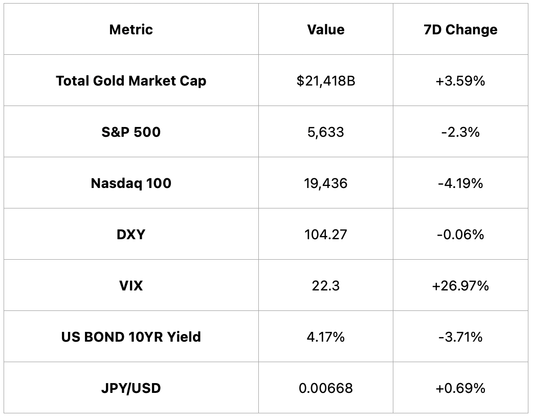 Gold outperformed traditional markets this week with a 3.59% gain, while equities slipped and market volatility surged as the VIX jumped nearly 27%.