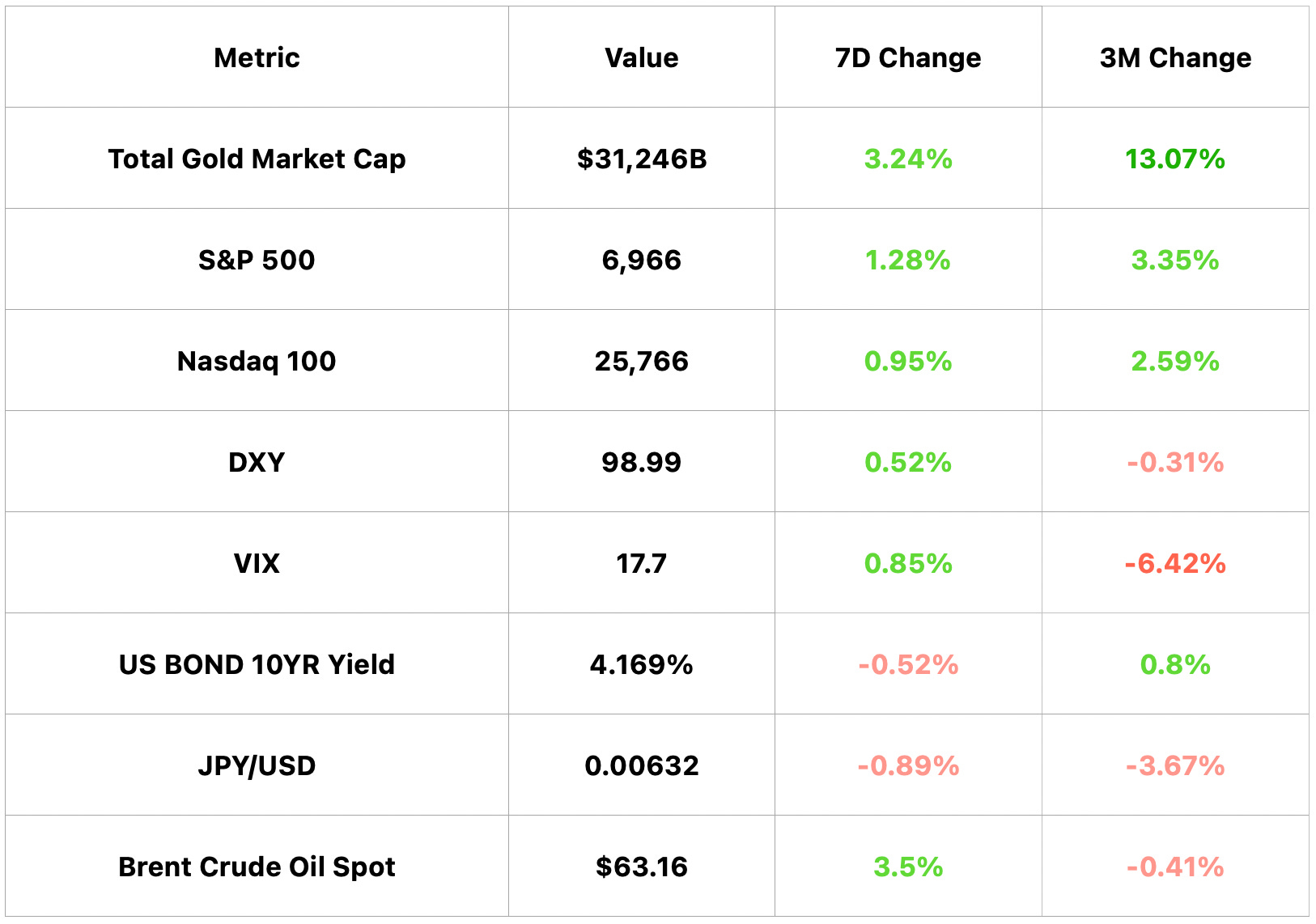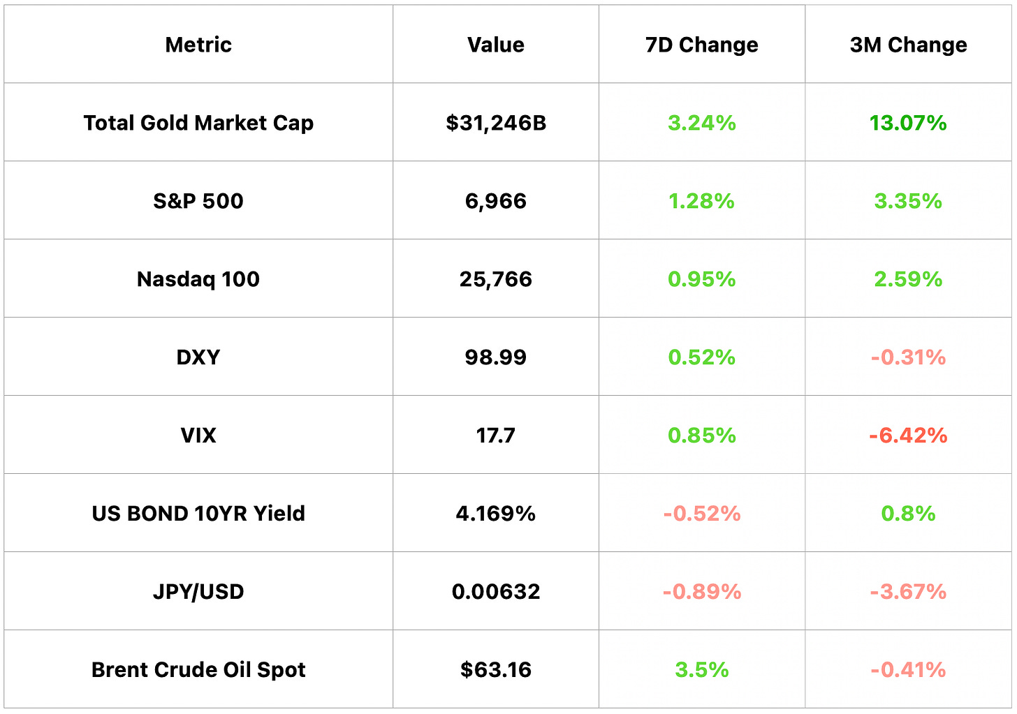 Gold market cap $31.25T, +3.24% WoW and +13.07% 3M; S&P 500 6,966, +1.28% WoW and +3.35% 3M; DXY 98.99, +0.52% WoW and −0.31% 3M; U.S. 10Y 4.169%, −0.52% WoW and +0.8% 3M.
