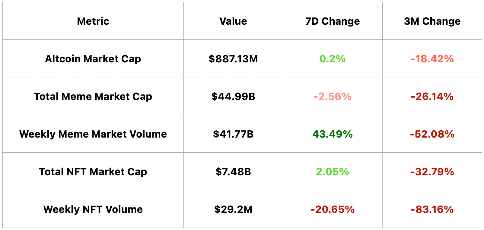 Altcoin market cap is $887.13M; memecoin market cap is $44.99B with $41.77B in weekly volume; NFTs market cap is $7.48B with $29.2M in weekly volume.