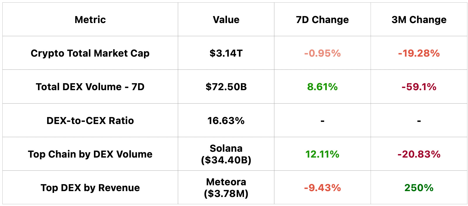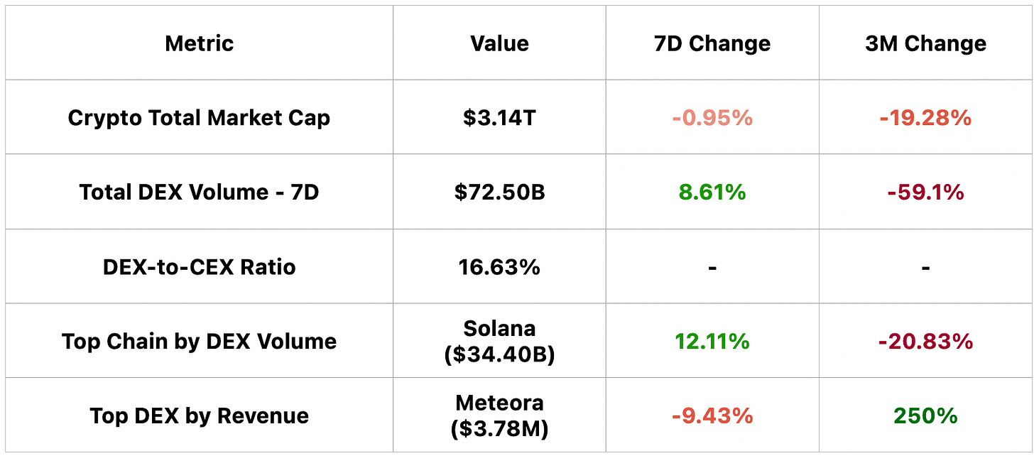 From a market data perspective: Crypto market cap is $3.14T; 7D DEX volume is $72.5B with a DEX to CEX ratio of 16.63%; Solana leads DEX volume at $34.4B; week over week.