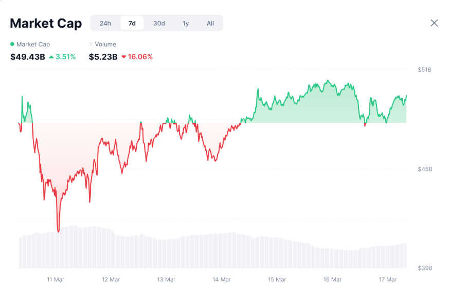 Over the past week, the market cap for memecoins reached $49.43B on March 17th, marking a 3.51% increase from the previous week. Meanwhile, daily trading volume came back to $5.23B on March 10th, reflecting a 16.06% decrease compared to last week.