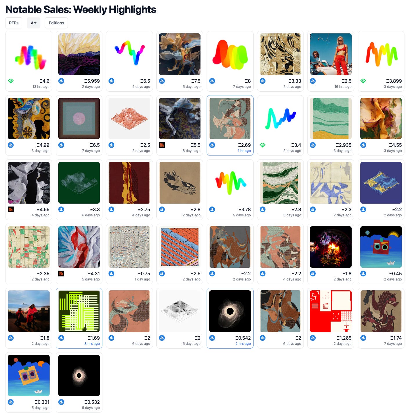 Chromie Squiggle, Winds of Yawanawa and Anticyclone stood out as the main NFT Art projects sold last week. Winds of Yawanawa has experienced in the past week an increase in trading volume, reclaiming public attention through its distinct aesthetic senses and creative ingenuity.