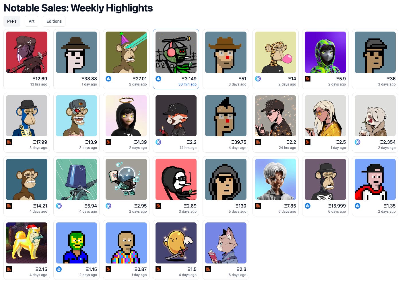 Last week, the primary NFT PFP projects that saw significant sales included BAYC, Crypto Punks and Elemental. These collections are famous for their charming characters and distinctive designs, which make them very popular in NFT market.
