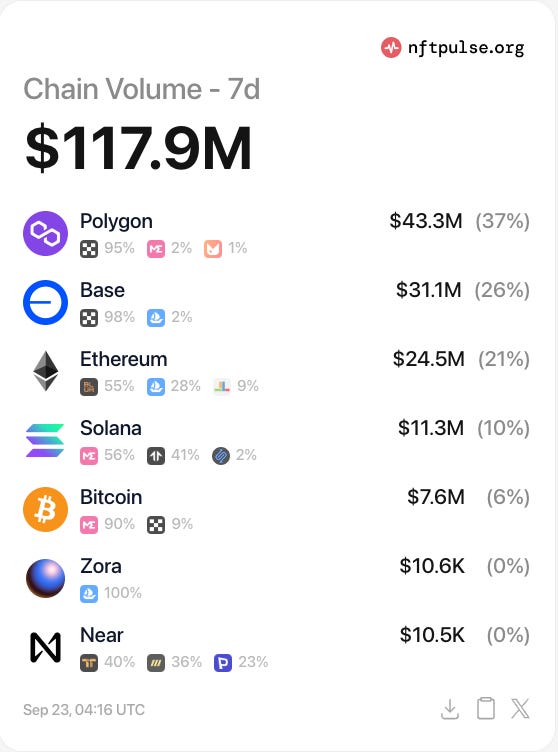 Over the past week, NFT marketplace volume went up to $117.9 million. Polygon claimed the top spot with a 37% market share, $43.3M chain volume, surpassing both Base and Ethereum. Base and Ethereum recorded $31.1M and $24.5M as volume, securing the second and third positions, respectively.