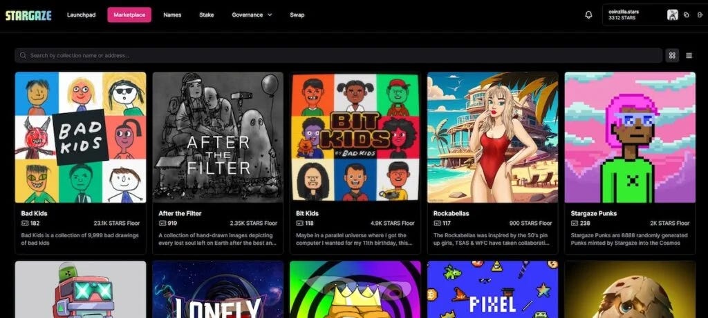 Unlock the power of the Cosmos with Stargaze, the premier NFT marketplace built on the Cosmos blockchain. Discover a universe of unique digital art, collectibles, gaming assets, and more – all connected by the seamless interoperability of the Cosmos network. Whether you’re a creator seeking a vibrant community or a collector exploring the frontiers of digital ownership, Stargaze is your gateway to the infinite possibilities of NFTs.
