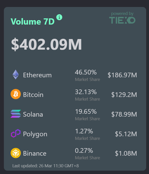 Over the past week, the NFT marketplaces reached a total volume of $402.09 million, with Ethereum leads the NFT marketplace with a 46.50% market share over the past week. Bitcoin,Solana,Polygon follow, with Bitcoin at a 32.13% market share.