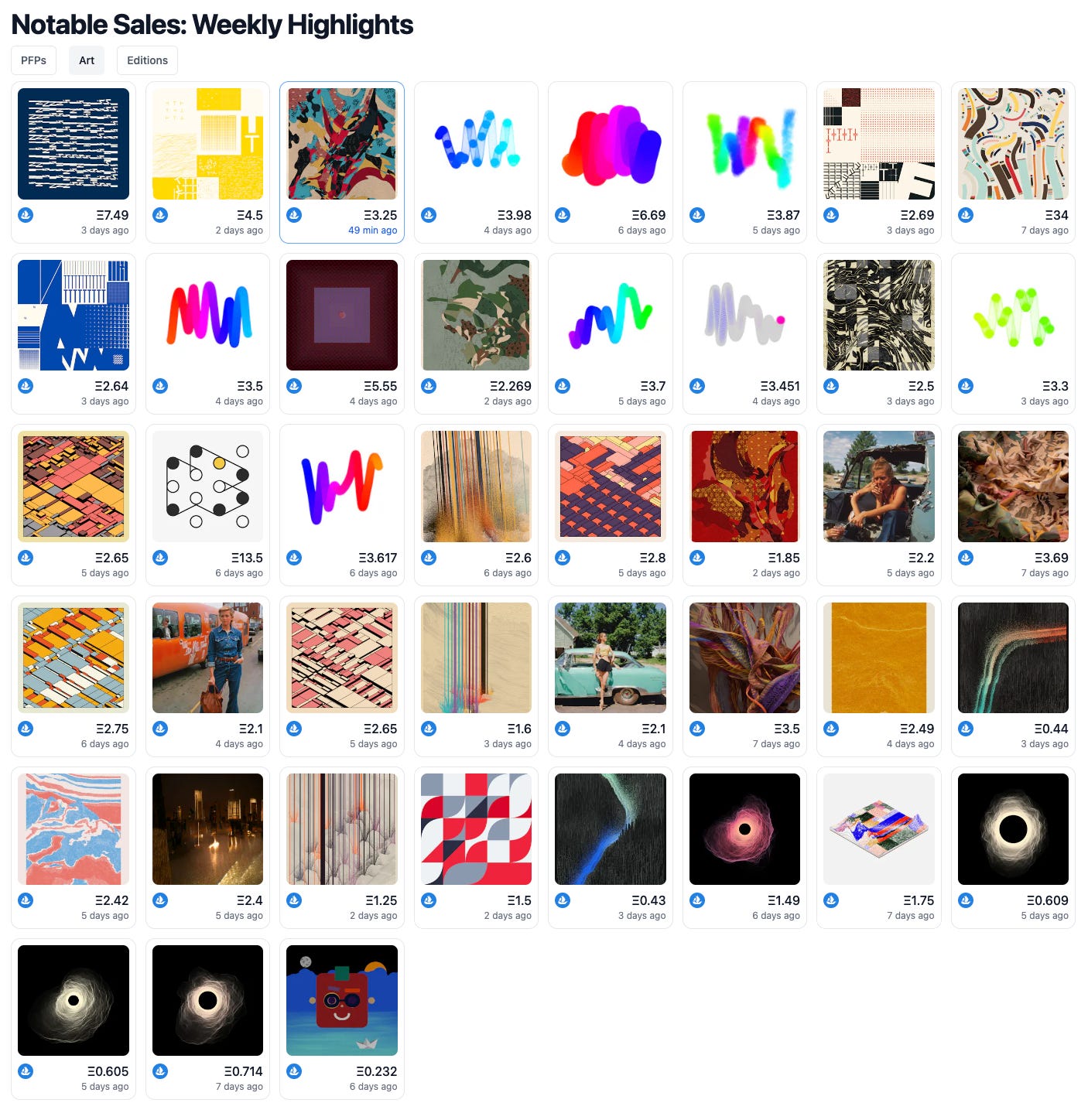 Chromie Squiggle, Themes and Variations and Memories of Qilin stood out as the main NFT Art projects sold last week. Themes and Variations has experienced in the past week an increase in transaction frequency, reclaiming public attention through its distinct aesthetic senses and creative ingenuity.