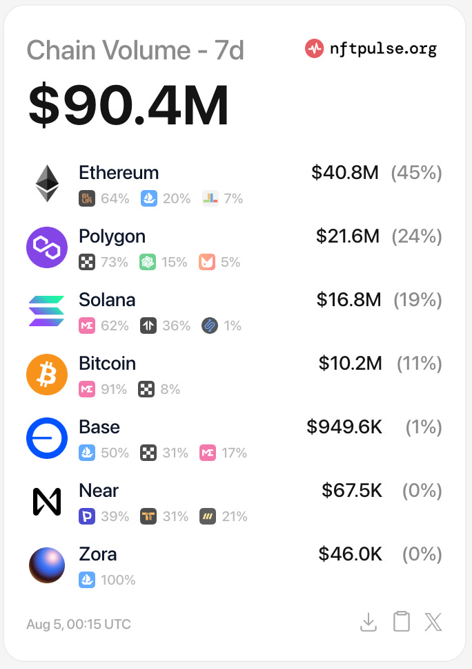 Over the past week, the NFT marketplaces reduced to a total volume of $90.4 million in total. ETHEREUM surpassed Polygon again and retake its 1st rank, with 45% market share.