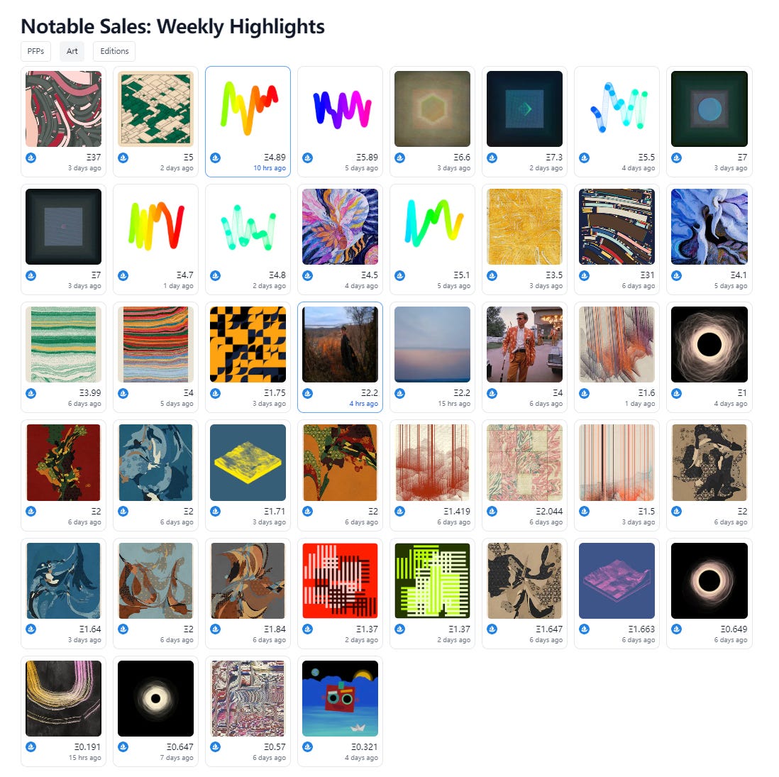Chromie Squiggle,Fidenza and Gazer stood out as the main NFT Art projects sold last week. These artworks are celebrated for their distinctive visual styles and the creativity of the artists involved, showcasing the diversity and innovation present in the digital art realm.
