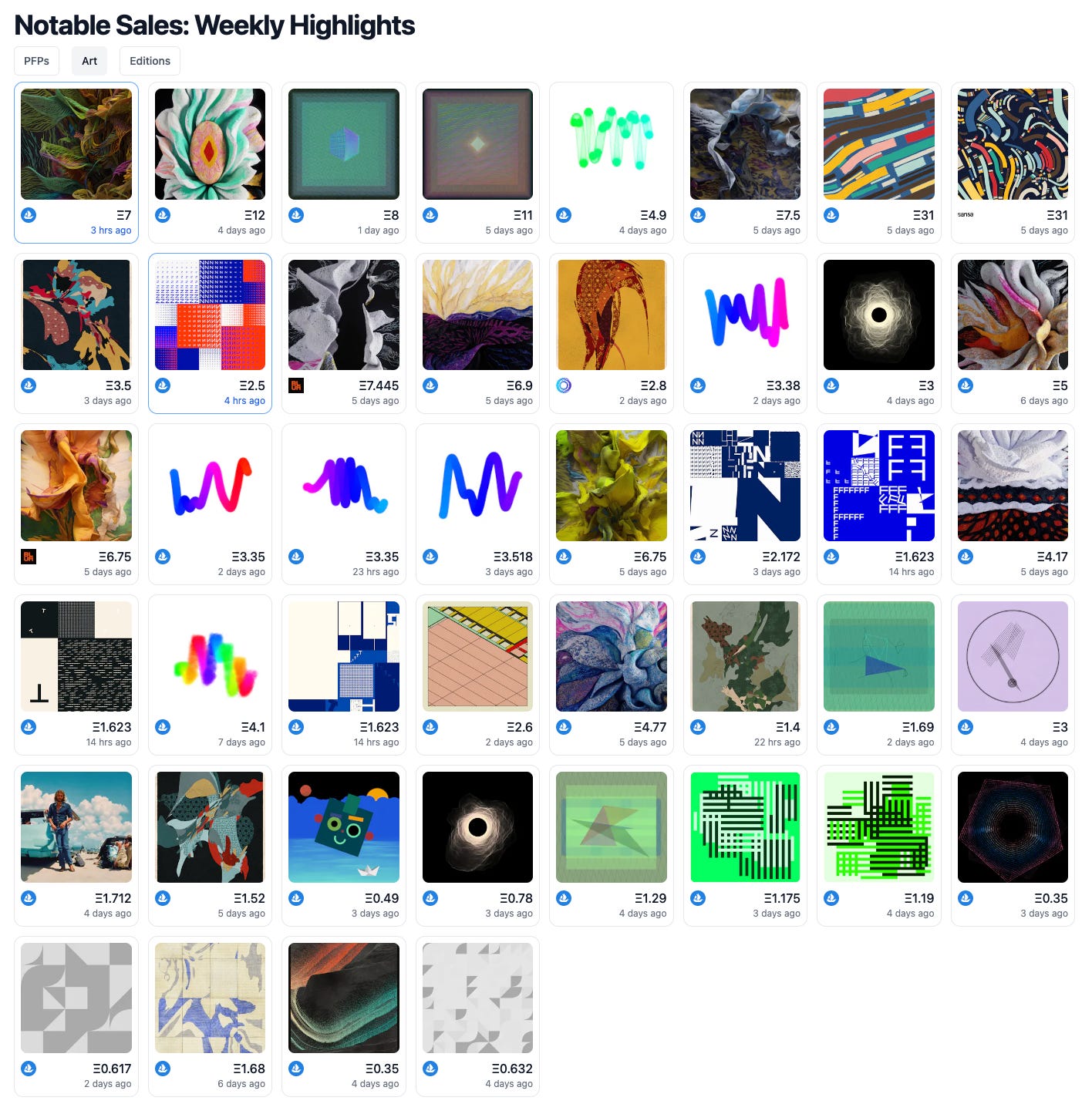 Winds of Yawanawa, Chromie Squiggle and Gazer stood out as the main NFT Art projects sold last week. Chromie Squiggle has experienced in the past week an increase in trading volume, reclaiming public attention through its distinct aesthetic senses and creative ingenuity.