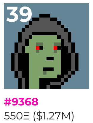 • Zombie Hoodie Punk #9368 was sold for 475 ETH on the 7th Sep then sold again for 550ETH on the 9th Sep . The new buyer’s identity remains unknown, though he/she also holds Ape Punk with Hoodie trait #2924, with a combined wallet value of 3.85K ETH.
