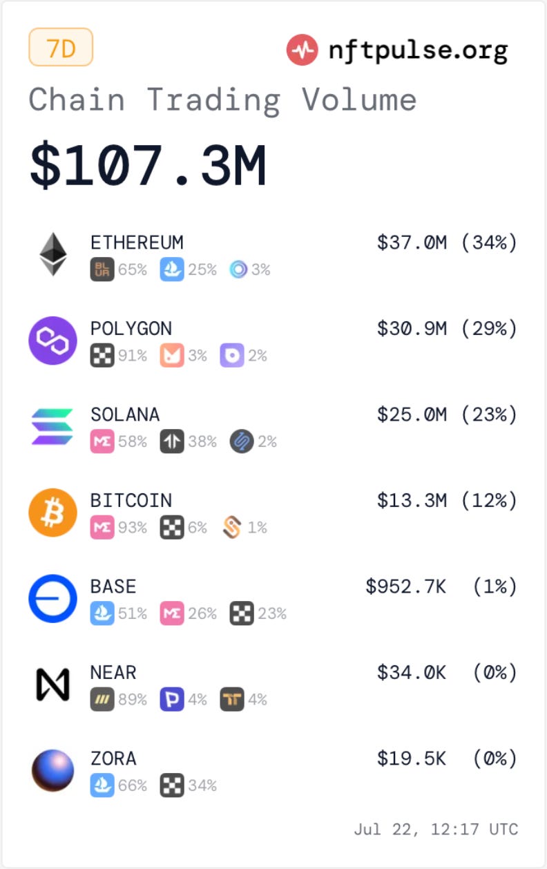 Over the past week, the NFT marketplaces reduced to a total volume of $107.3 million in total. ETHEREUM surpassed Polygon again and retake its 1st rank of market share.