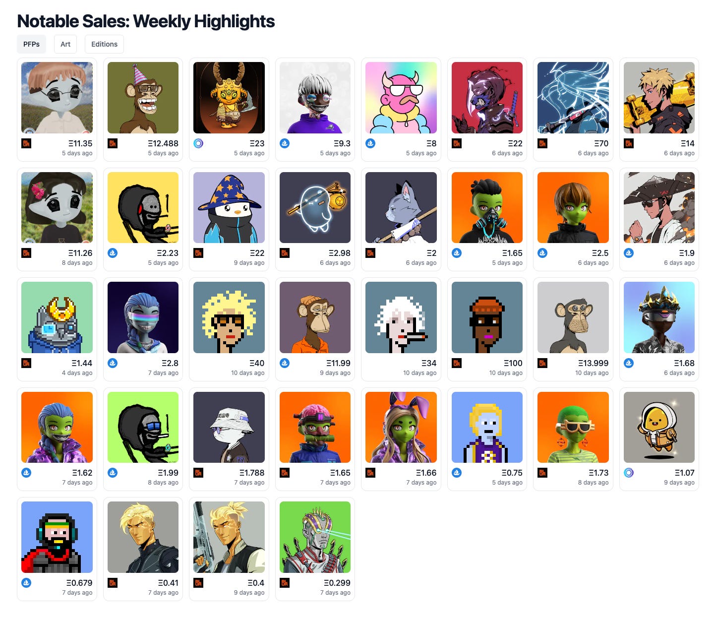 Last week, the primary NFT PFP projects that saw significant sales included BAYC, Azuki and Milady. These collections are famous for their charming characters and distinctive designs, which make them very popular in NFT market.