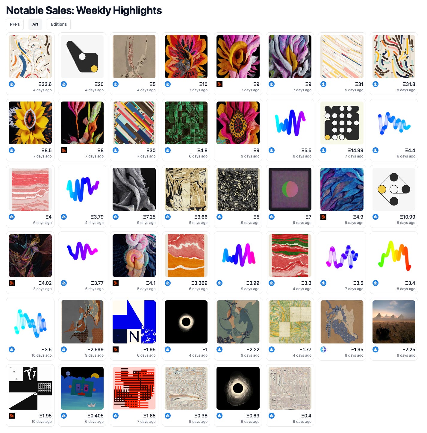 Chromie Squiggle, Winds of Yawanawa and Fidenza stood out as the main NFT Art projects sold last week. Winds of Yawanawa has experienced in the past week an increase in trading price, reclaiming public attention through its distinct aesthetic senses and creative ingenuity.