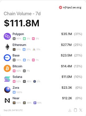 Over the past week, NFT marketplace volume went up to $111.8 million. Polygon claimed the top spot with a 31% market share, $35.1M chain volume, surpassing both Base and Ethereum. Ethereum and Base recorded $27.7M and $23.5M as volume, securing the second and third positions, respectively.