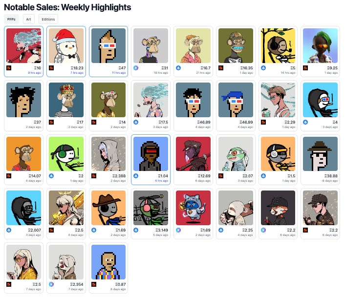 Last week, the primary NFT PFP projects that saw significant sales included BAYC, Crypto Punks and Azuki. These collections are famous for their charming characters and distinctive designs, which make them very popular in NFT market.