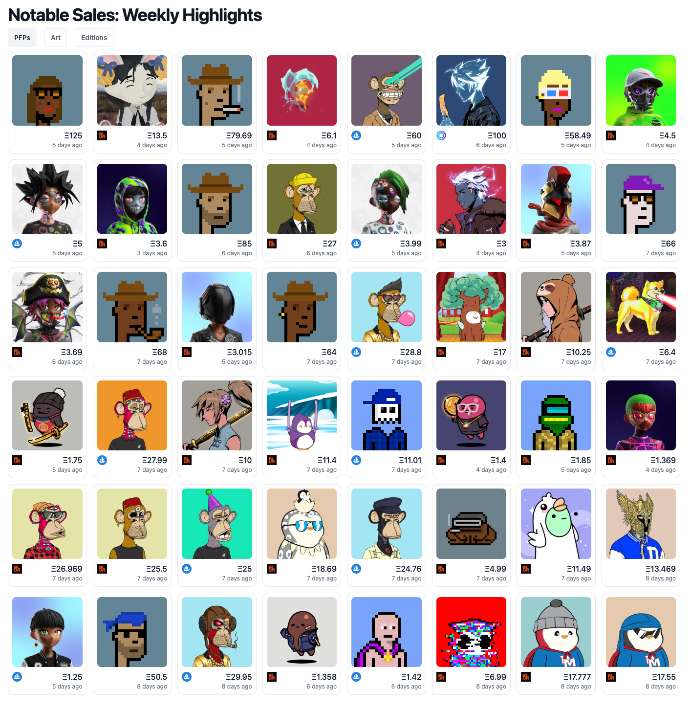 Last week, the primary NFT PFP projects that saw significant sales included BAYC, Crypto Punks, and Azuki. These collections are famous for their charming characters and distinctive designs, which make them very popular in NFT market.