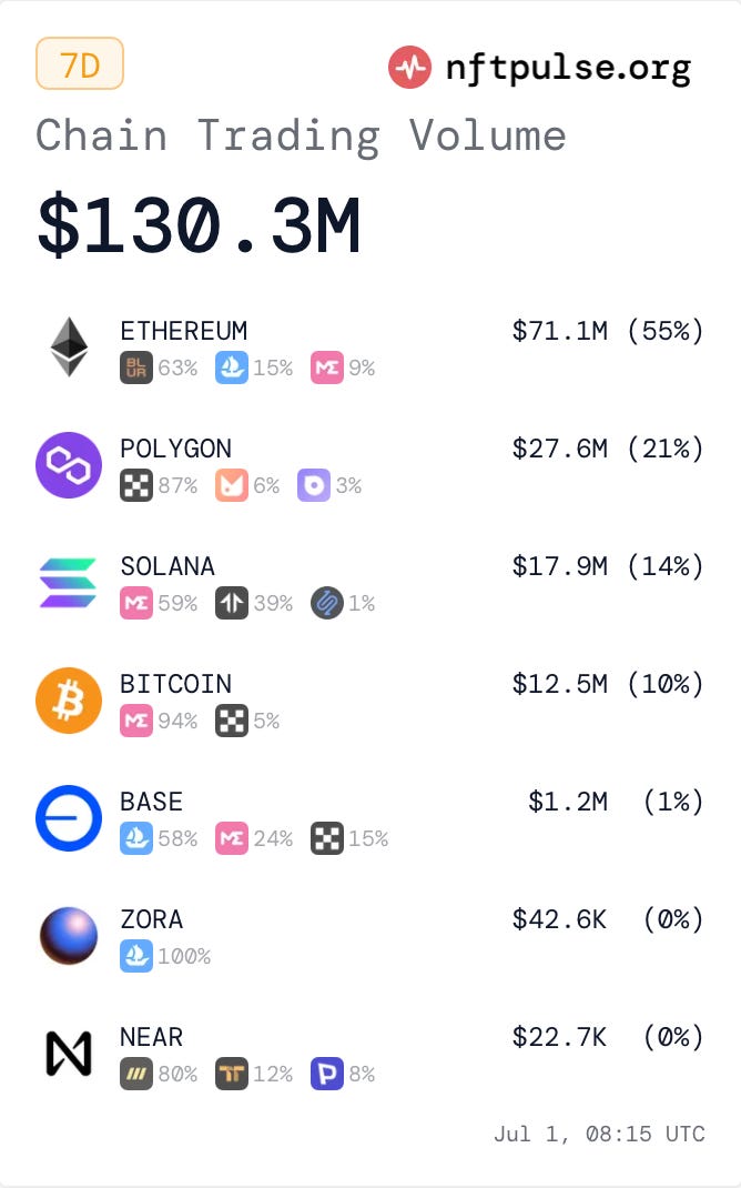 Over the past week, the total volume of NFT marketplaces decreased to $130.3 million, a drop of 22.6% from the previous week. ETHEREUM leads the market with a 55% share, while Polygon has risen to the second spot with a 21% market share.