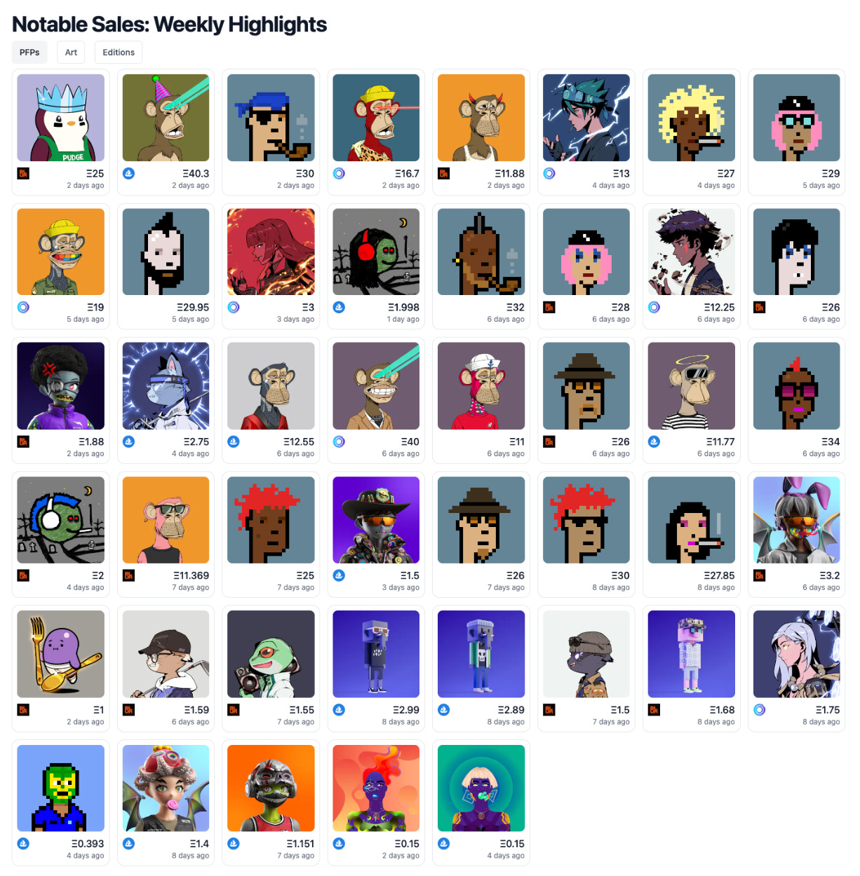 Last week, the primary NFT PFP projects that saw significant sales included BAYC, Crypto Punks andAzuki. These collections are famous for their charming characters and distinctive designs, which make them very popular in NFT market.