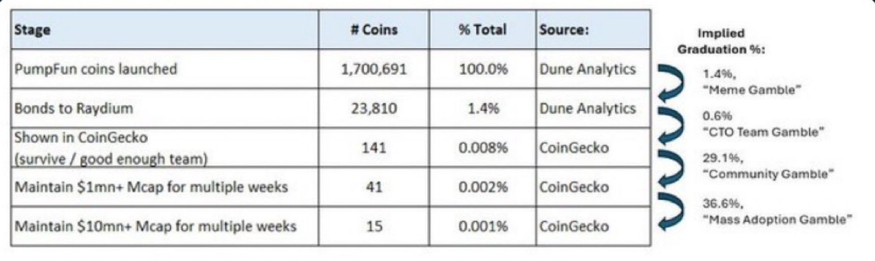 Analysis shows that only 1.4% of Pump.fun coins will bond to Raydium. Tokens which maintain $10 Million market cap for multiple weeks are less than 0.001% of the total tokens on the platform.