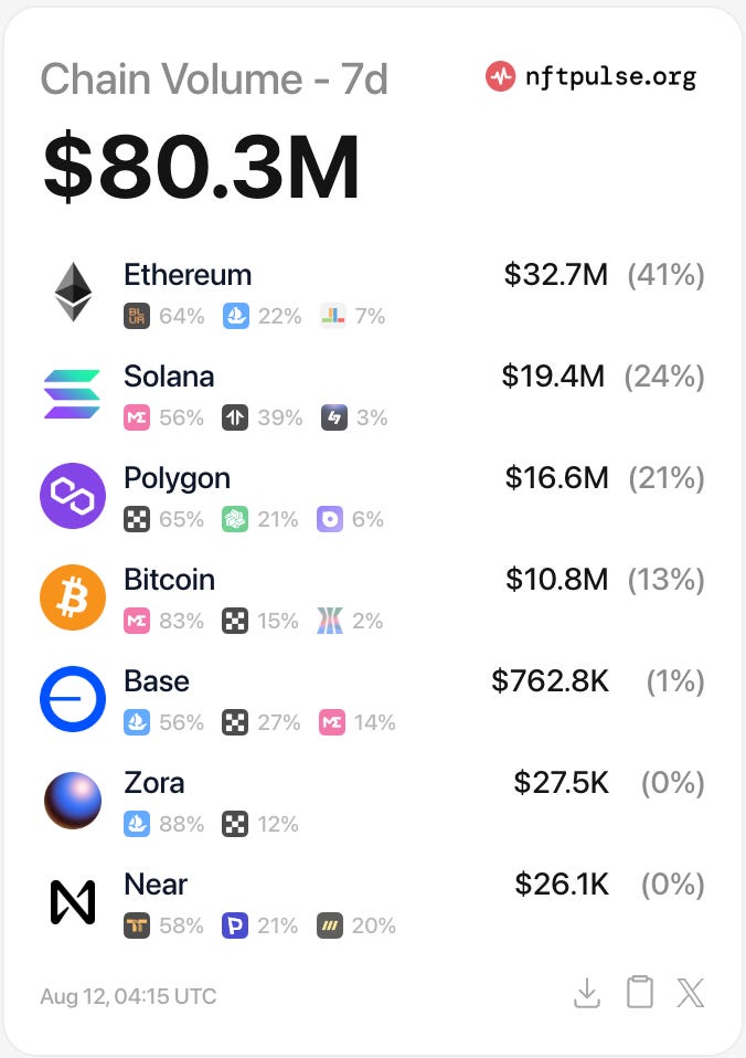 Over the past week, the NFT marketplaces reduced to a total volume of $80.3 million in total. ETHEREUM surpassed Polygon again and retake its 1st rank,with 41% market share.