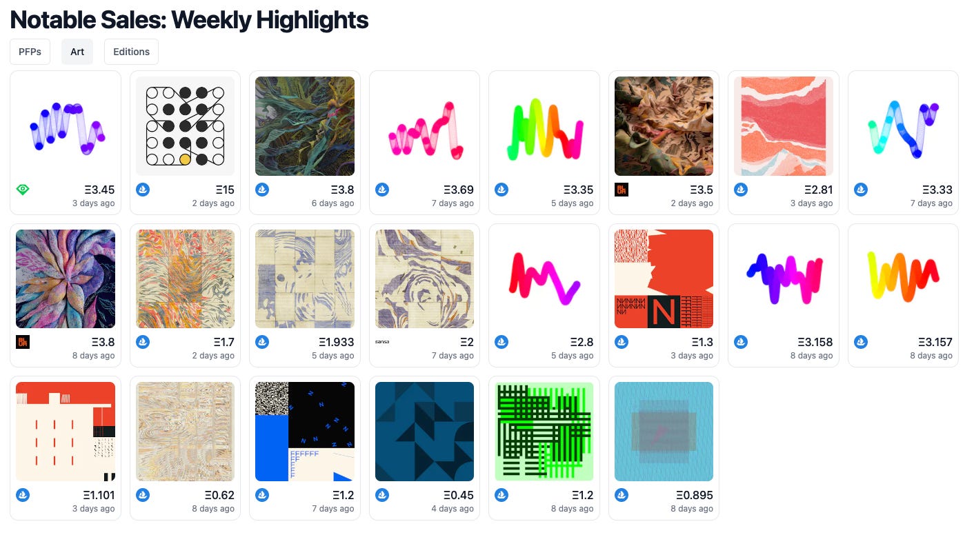 Chromie Squiggle, Winds of Yawanawa and Ringer stood out as the main NFT Art projects sold last week. Ringer has experienced in the past week an increase in trading volume, reclaiming public attention through its distinct aesthetic senses and creative ingenuity.