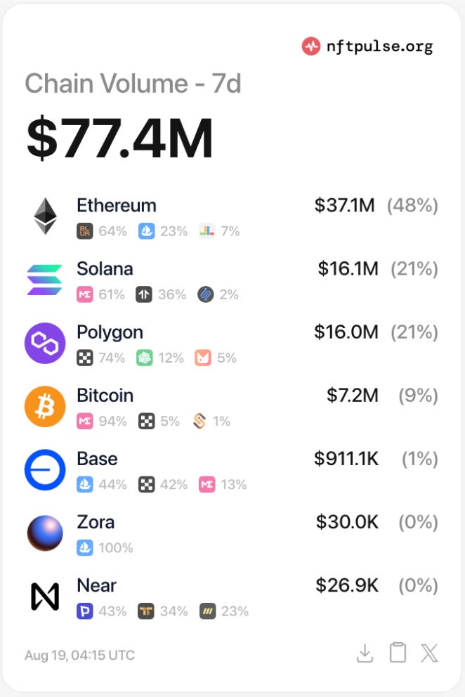 Over the past week, NFT marketplaces saw their total volume drop to $77.4 million. Ethereum continues to lead the market, holding the top position with a 48% share.