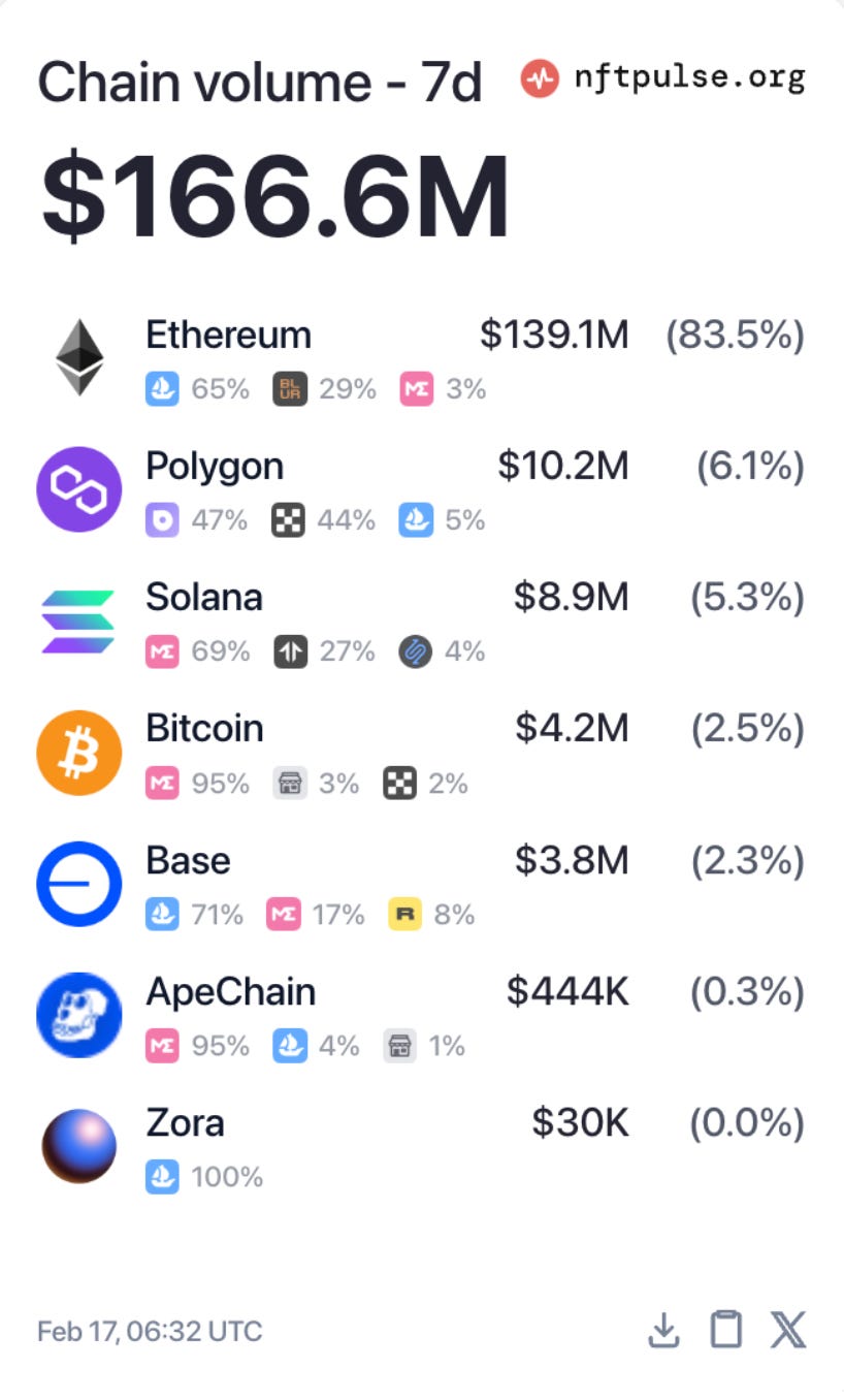 Ethereum claimed the top spot with a 83.5% market share while with $139.1M chain volume. Polygon and Solana are ranked 2nd and 3rd, with 6.1% and 5.3% chain volume respectively.