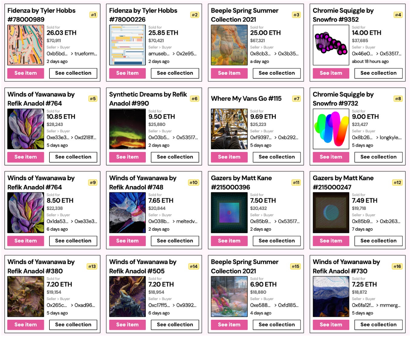 In the realm of Art NFTs, Winds of Yawanawa, Fidenza, and Beeple Spring Summer Collection have made the list. Notably, Fidenza #78000989 has reached a selling price of 26.03 ETH.