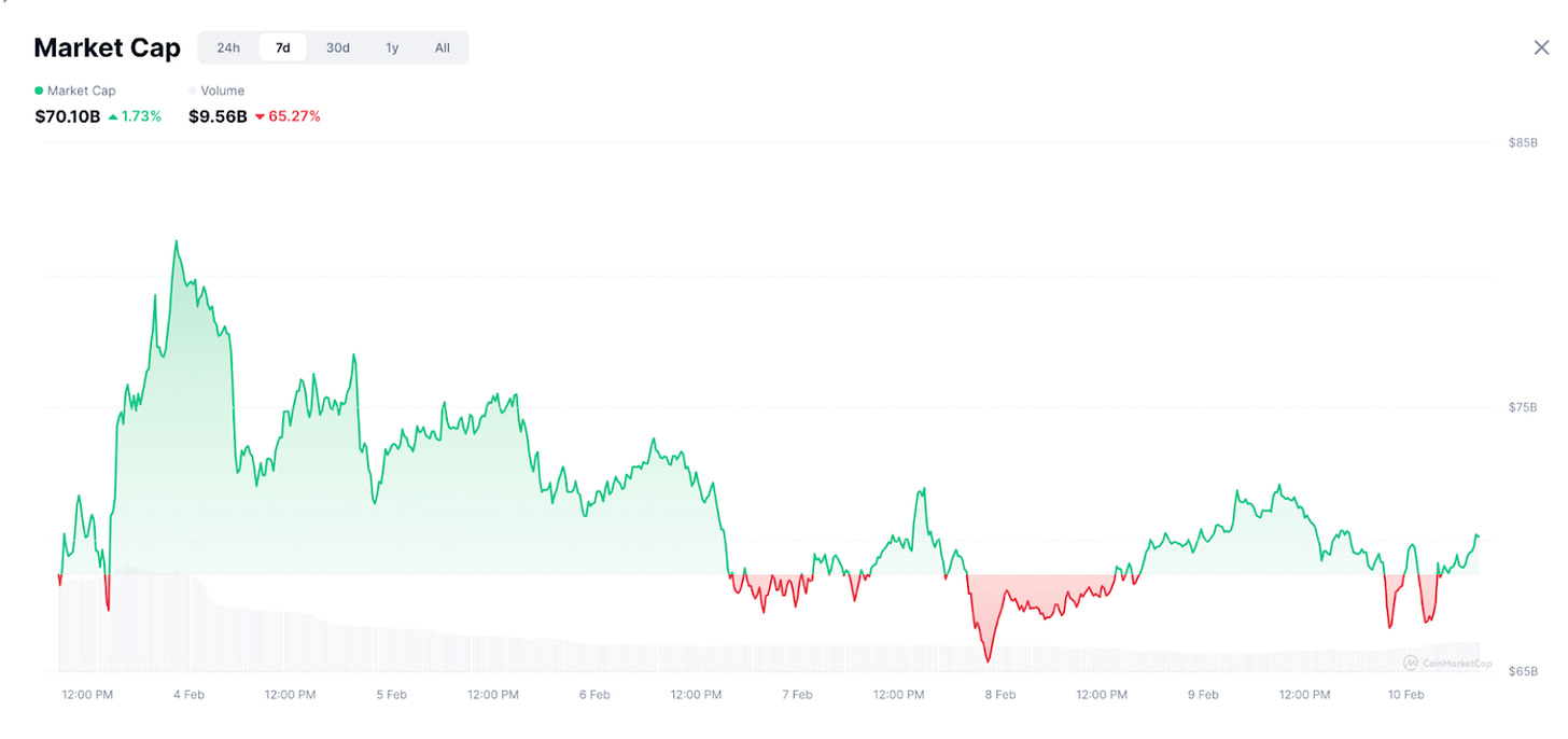 Meanwhile, daily trading volume dropped to $9.56B on February 10th, reflecting a 65.27% decline compared to last week.