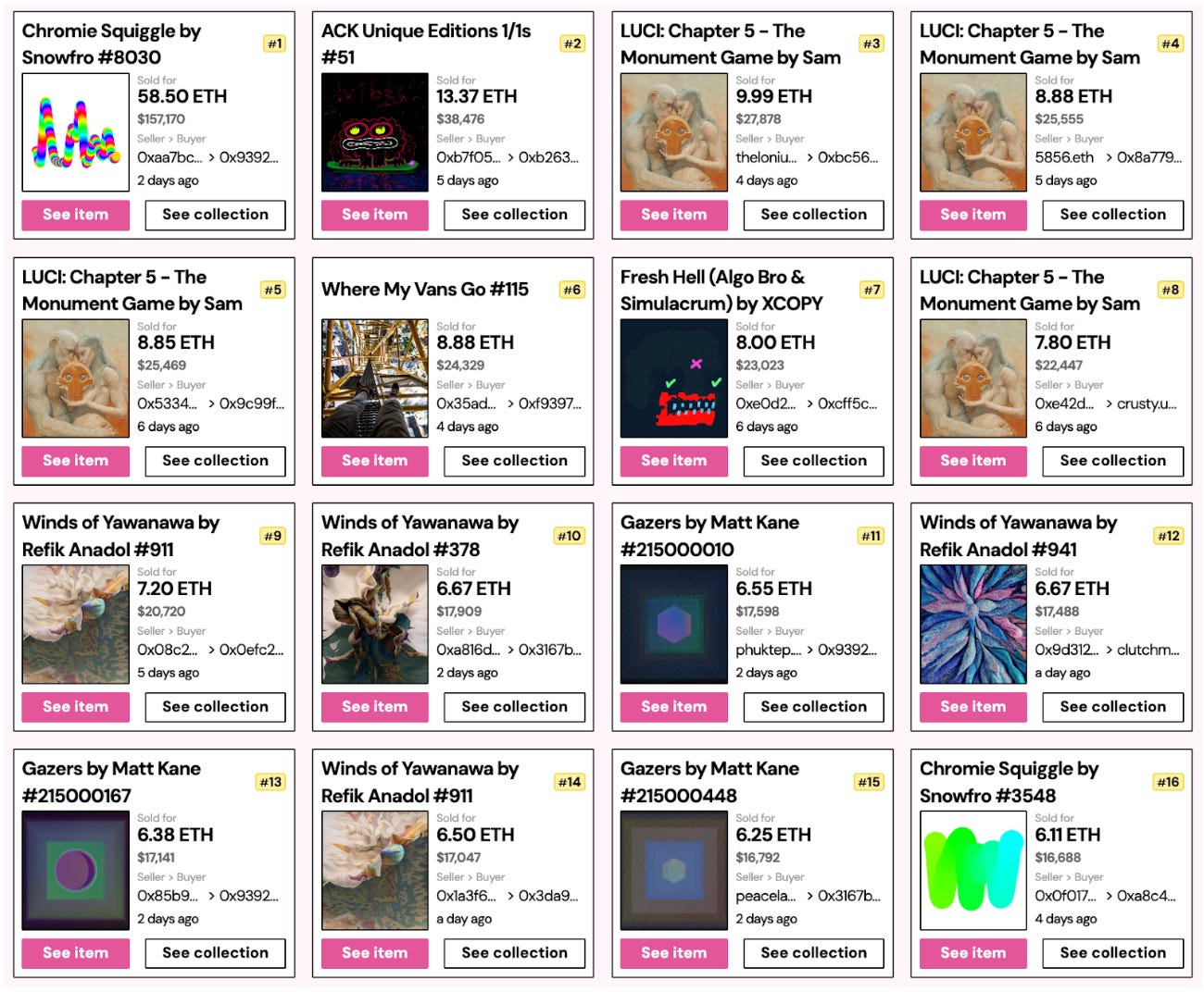 In the realm of Art NFTs, Winds of Yawanawa, Chromie Squiggle, and ACK Unique Edition have made the list. Notably, Chromie Squiggle #8030 has reached a selling price of 58.5 ETH.