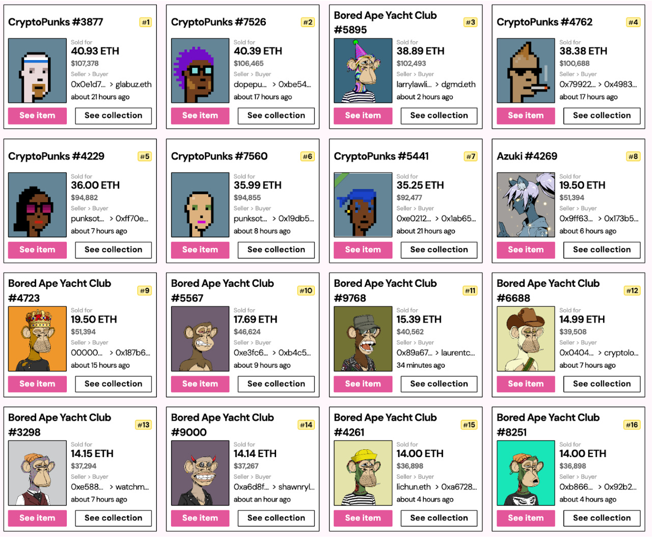 Last week, the primary NFT PFP projects that saw significant sales included Crypto Punks, BAYC and Azuki. The collection is famous for their charming characters and distinctive designs, which make them very popular in the NFT market.