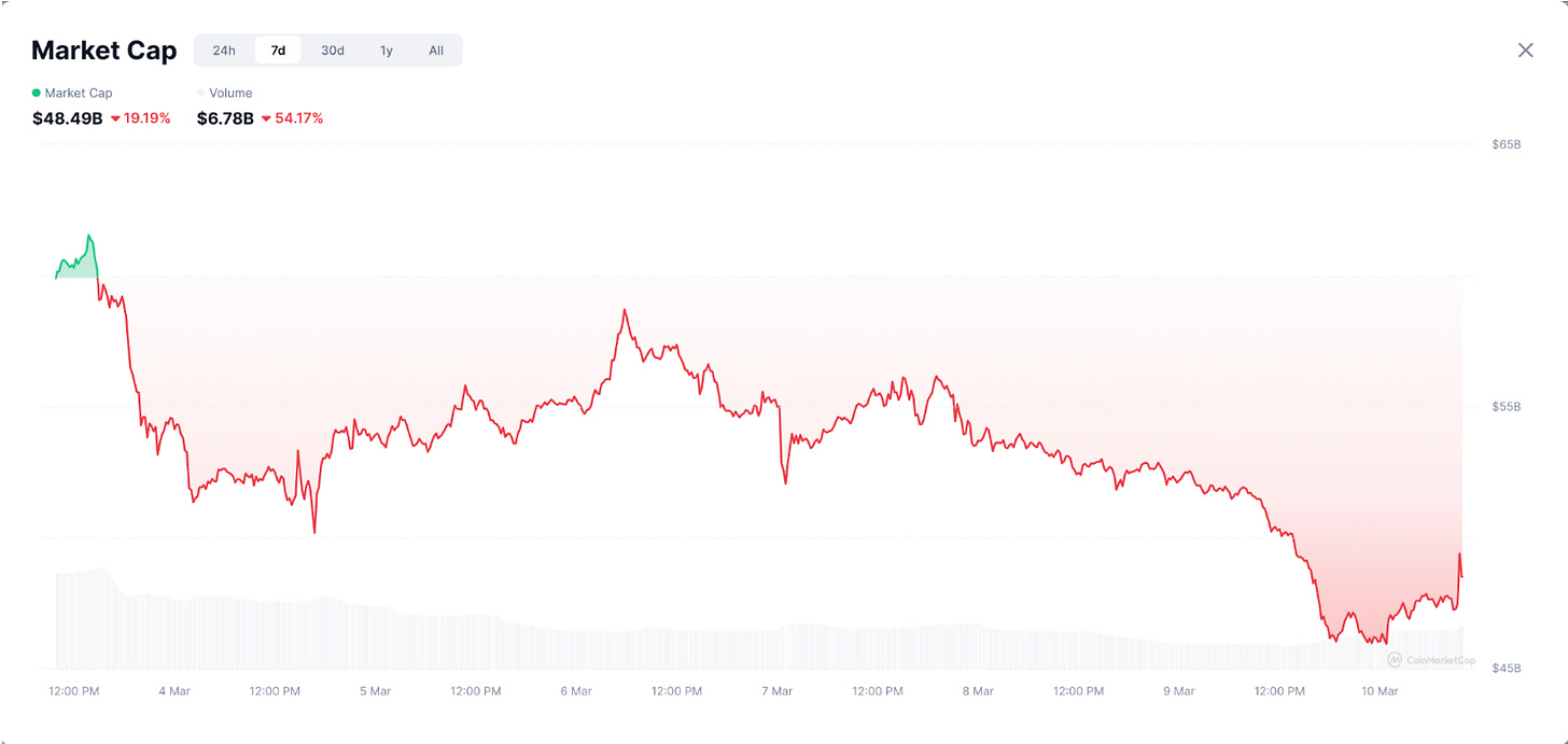 Meanwhile, daily trading volume came to $6.78B on March 10th, reflecting a 54.17% decrease compared to last week.